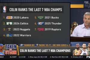在播客节目中,名嘴Colin Cowherd给这七个总冠军进行排名,他给出的排名是: