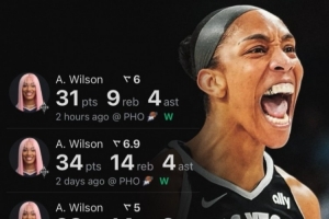 此役,阿贾-威尔逊在36分钟的时间里,投篮21中7,三分球2中0,罚球19中17,砍下31分9篮板4助攻2抢断3盖帽的数据。