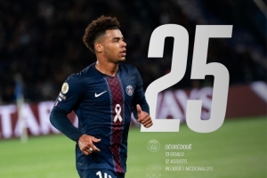 巴黎官方统计,杜埃职业生涯至今参与25粒法甲进球(13球12助),成为在法甲首位达成这一数据的2004年及之后出生球员。
