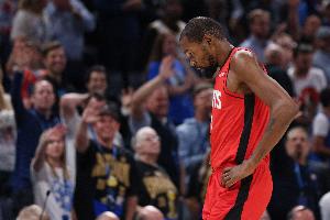 比赛最后几分钟的大部分进攻回合,火箭都是由杜兰特负责持球推进。每一次他持球,现场18055名观众都会起身欢呼,为这位球队新核心得分手喝彩,杜兰特也注意到了这一点。