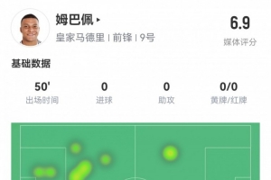 体育资讯2月12日讯 欧冠淘汰赛附加赛首回合,曼城主场半场1-0领先皇马。姆巴佩半场重点数据如下↓