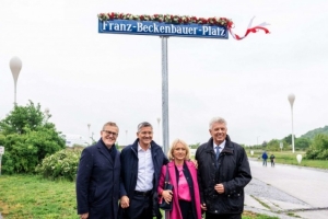 “以他之名的不是一条普通的街道,因为他的人生从未是一条直线;也不是一条皇家的林荫大道,因为他从不追求华丽。在他眼中,总是重要的是:自由的空间、辽阔的视野、更高层次的目标。在弗朗茨-贝肯鲍尔那里,每个人都有属于自己的一席之地。他的位置。人们在铭牌下自拍时,也应该时刻记住这一点。”
