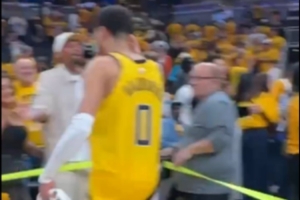 赛后,步行者球星哈利伯顿来到场边,和前球队主控乔治-希尔拥抱致意。