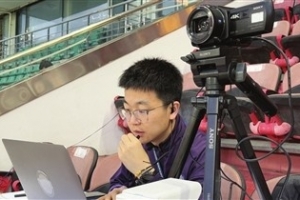 比赛日,技术组的朱嘉程和助理教练张力,通常是在看台高处看比赛,与替补席教练通过对讲机和电脑实时互动,这就需要提前一天选定位置、调试设备。高处的观察视角和拍摄角度,与主教练和其他助理教练在替补席所看到的情况,能够形成互补。
